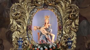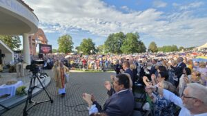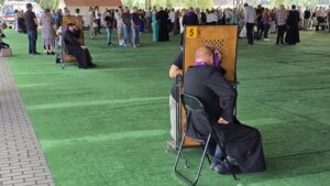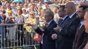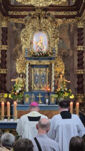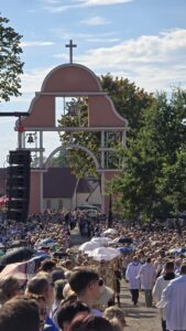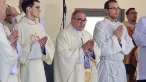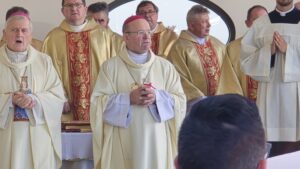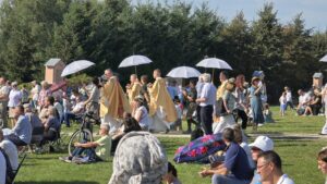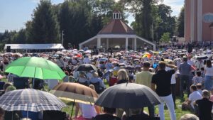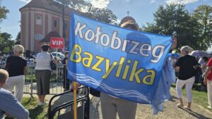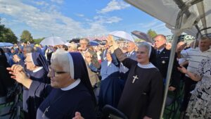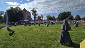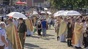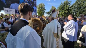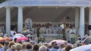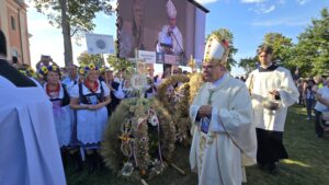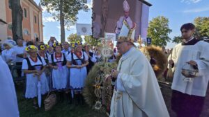 Skrzatusz – to najważniejsze Sanktuarium Matki Bożej Bolesnej w naszej diecezji. Już od 450 lat słynie ono z obecności cudownej Piety wykonanej zasadniczo z drzewa wierzbowego, a po części z lipowego, do której już od wieków pielgrzymują wierni, aby uprosić u Matki Bożej liczne łaski i uzdrowienia. Ostatnie trzy lata nasza diecezja duchowo przygotowywała się do jubileuszu 450 – lecia obecności Piety Matki Bożej poprzez peregrynację kopii cudownej Piety po wszystkich parafiach, a także poprzez Nowennę do Matki Bożej Bolesnej Łaskami Słynącej w Skrzatuszu. Główne uroczystości zaplanowane zostały na niedzielę 21 września. Tego dnia do skrzatuskiego Sanktuarium przybyły tysiące wiernych, zarówno autokarami, jak i samochodami osobowymi. Niektórzy pielgrzymi zdecydowali się wyruszyć pieszo, by pokonując wiele kilometrów ofiarować Matce Bożej swój trud i wyprosić potrzebne łaski. Przepiękna, słoneczna pogoda towarzyszyła uroczystościom od samego rana – tak, jakby całe niebo i wszystkie dary natury chciały pokazać jak bardzo radują się wraz ze stworzeniem ludzkim jubileuszowymi wydarzeniami. Od godz. 11:00 pielgrzymi zebrani na placu mogli wysłuchać ciekawej konferencji na temat 450 – lecia obecności Piety Matki Bożej w Skrzatuszu oraz historii Sanktuarium, którą wygłosił ks. dr Tadeusz Ceynowa. Po konferencji została wniesiona figura Matki Bożej i ustawiona przy ołtarzu polowym. Zanim rozpoczęła się Msza św. wniesiono także sztandary oraz wieńce żniwne. Jeszcze przed godz. 13:00 spod Sanktuarium wyruszyła asysta liturgiczna, która zatrzymała się przy nowej bramie – dzwonnicy, wotum wdzięczności Panu Bogu za obecność Matki Bożej w Skrzatuszu. Dzwonnicę z pięcioma dzwonami poświęcił nuncjusz apostolski abp Antonio Guido Filipazzi. Mszę św. koncelebrowało kilkudziesięciu kapłanów z całej diecezji, a głównymi gośćmi oprócz nuncjusza apostolskiego był abp Tadeusz Wojda, abp Wiesław Śmigiel, bp Grzegorz Balcerek, bp Adrian Put, bp Tadeusz Lityński oraz bp senior Edward Dajczak i administrator diecezji koszalińsko – kołobrzeskiej bp Krzysztof Zadarko, który na wstępie Mszy św. powitał wszystkich zgromadzonych i podziękował za obecność i przybycie do domu Matki w tak szczególnym dniu. Główny celebrans Mszy św. abp Antonio Guido Filipazzi pochodzący z Włoch wygłosił homilię w języku polskim na temat znaczenia Matki Bożej w życiu chrześcijanina, a na koniec przekazał błogosławieństwo papieża Leona XIV. Po Eucharystii do mikrofonu podszedł także szef gabinetu Karola Nawrockiego – Paweł Szefernaker, który odczytał list od Prezydenta Polski. Został on nagrodzony gromkimi brawami zgromadzonych na placu pielgrzymów. Po Mszy św. poświęcono wieńce żniwne i wręczono jubileuszowe świece delegacjom ze wszystkich dekanatów diecezji. W imieniu kołobrzeskiego dekanatu delegatami było małżeństwo – Renata i Stanisław Kurdybacha. Uroczystości zakończyły się jubileuszową modlitwą zawierzenia diecezji. Msza św. transmitowana była przez diecezjalną telewizję Dobre Media oraz przez TV Polonia.