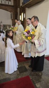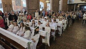W naszej parafii jako pierwsi do tego uroczystego obrzędu przystąpili uczniowie ze Szkoły Podstawowej nr 3. Przygotowania do tego wydarzenia trwały wiele miesięcy, podczas których dzieci pogłębiały swoją wiedzę religijną, uczyły się modlitw oraz odkrywały znaczenie Eucharystii. W tym ważnym procesie towarzyszyła im s. Katarzyna, która z pełnym oddaniem i zaangażowaniem wspierała najmłodszych w duchowej drodze do pierwszego spotkania z Jezusem.