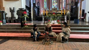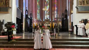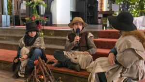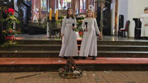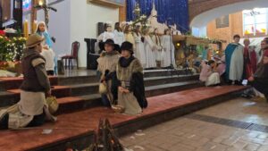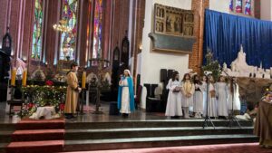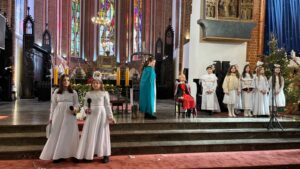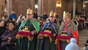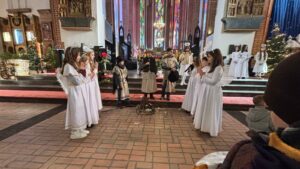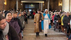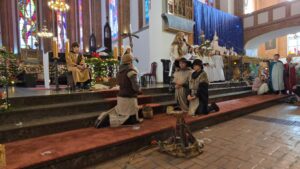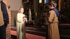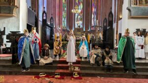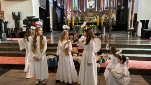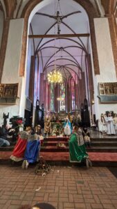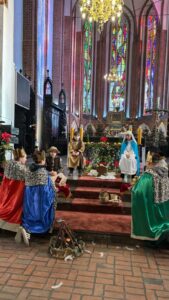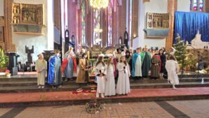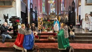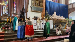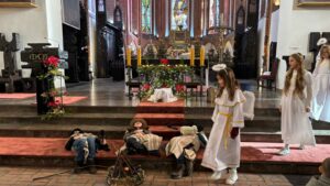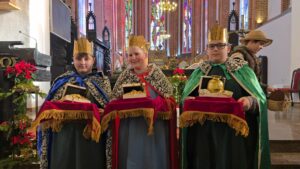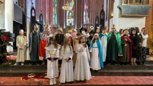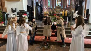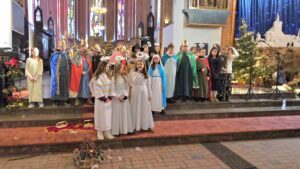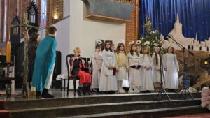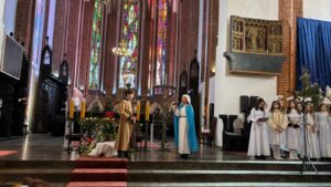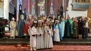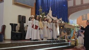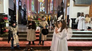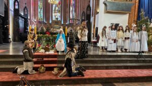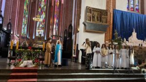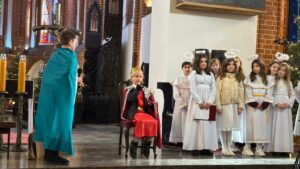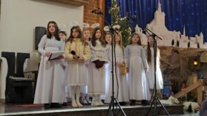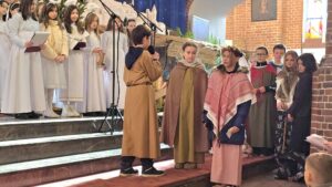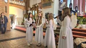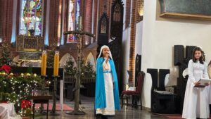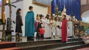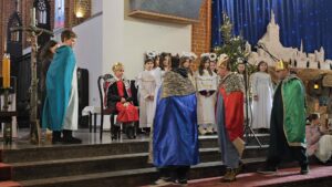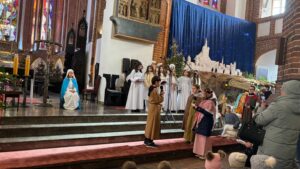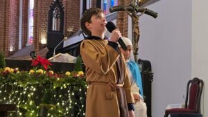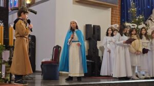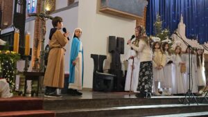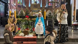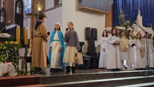 W naszej świątyni dało się dziś odczuć świąteczną Bożonarodzeniową atmosferę. Uczniowie SP 4 pod opieką Siostry Marleny przedstawili Jasełka. Scenki ukazywały historię narodzenia Jezusa. Można było zobaczyć scenę szukania miejsca przez Józefa i Maryję, ukazanie się pasterzom Anioła, zajrzeć do pałacu króla Heroda i poznać scenę pokłonu Mędrców. Poszczególne scenki były przeplatane piosenkami i kolędami. Radość była wielka.