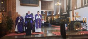 Wieczorna Msza św. była nabożeństwem dziękczynnym za 45 lat działalności Zespołu Pieśni i Tańca „Tirlitonki”, założonego w 1980 roku przez panią Marię Dudek. Przez te lata w zespole Tirlitonek przewinęło się wiele dziewcząt i chłopców z miasta i gminy Kołobrzeg. Niektórzy z nich osiągnęli i osiągają duże sukcesy w kraju i za granicą, co podkreślili na koncercie jubileuszowym, który odbył się dzień wcześniej w Regionalnym Centrum Kultury w Kołobrzegu. Jednym z absolwentów Zespołu Pieśni i Tańca „Tirlitonki” jest ks. Sebastian Kapuściński, który razem z proboszczem naszej parafii, ks dr Andrzejem Pawłowskim i ks. prałatem Józefem Potyrałą modlił się we Mszy św. dziękczynnej. Ks. Sebastian w swoim kazaniu nawiązał do okresu, kiedy był członkiem zespołu Tirlitonki. Podkreślił, że ten okres w jego życiu był dla niego ważny, bo w części ukształtował jego charakter, który w chwili obecnej przynosi dobre owoce. Wspomniał o rodzinnej, ciepłej atmosferze będącej w Zespole, a która wynika z podejścia do młodych ludzi przez panią Marię Dudek i jej córkę, panią Agatę Chimko, wspierającą mamę.