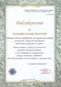 Już tradycją się stało, że podczas Orszaku Trzech Króli zbieramy czekolady dla seniorów z Domów Opieki Społecznej w powiecie kołobrzeskim. W tym roku do koszy uczestnicy Orszaku włożyli prawie 350 słodkich podarunków, w zdecydowanej większości różnego rodzaju czekolad. Ale były też i ptasie mleczka, herbatniki. Jak nam powiedziała pani dyrektor Domu Opieki Społecznej we Włościborzu, Małgorzata Rzepka- Klincewicz, te słodkie upominki sprawiają wielką radość jej podopiecznym. Podobnie jest w Domu Opieki Społecznej w Gościnie, co przekazała nam pani dyrektor, Aneta Walczak. Obie panie z serca w imieniu swoim i swoich podopiecznych dziękują wszystkim Orszakowym darczyńcom.