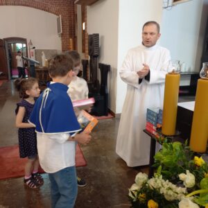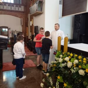 W niedzielę 22 czerwca podczas Mszy św. o godz. 11.30 dzieci, katecheci, nauczyciele i rodzice dziękowali Bogu za cały rok szkolny i katechetyczny. W darach przyniesione zostały m.in. plansze, które dzieci uzupełniały naklejkami po każdej Mszy św. niedzielnej oraz dyplomy i medale, które zdobyły podczas różnych konkursów i turniejów. Pod koniec Mszy św. w sposób szczególny dzieci podziękowały Siostrze Katarzynie za sześć lat pięknej pracy w naszej parafii. Decyzją przełożonych Siostra odchodzi od nas do innej parafii. Po zakończonej Eucharystii dzieciom, które wiernie zbierały naklejki po Mszach świętych, ks. Łukasz wręczył upominki.